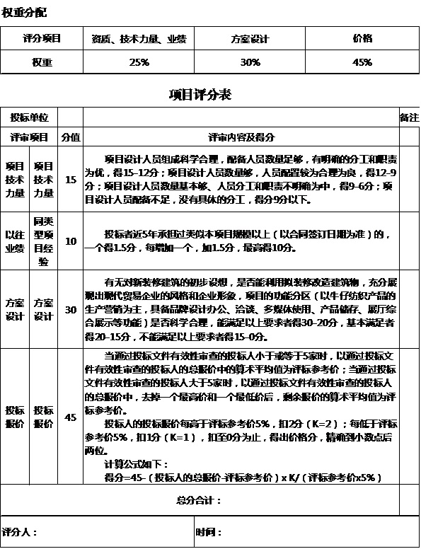 十三、本招標(biāo)項(xiàng)目以評(píng)分權(quán)重分配原則進(jìn)行評(píng)標(biāo),評(píng)分項(xiàng)目含有資質(zhì)、技術(shù)力量、業(yè)績(jī),占比25%;方案設(shè)計(jì),占比30%;投標(biāo)價(jià)格,占比45%。以綜合得分高者中標(biāo)。項(xiàng)目評(píng)分表詳見附件。