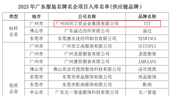 喜報(bào):紡織公司成功入選“2023年廣東服裝名牌名企項(xiàng)目入庫名單(供應(yīng)鏈品牌)”