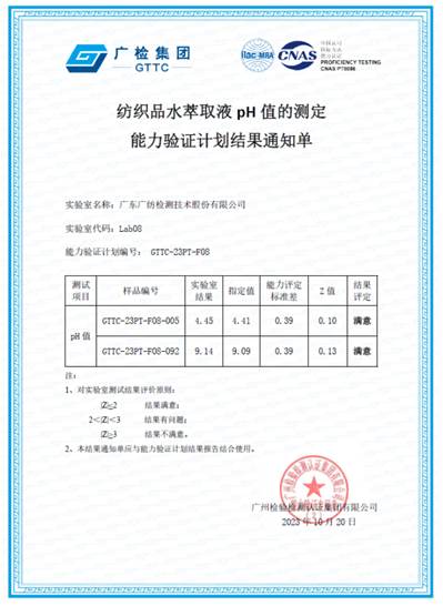 總鉛和總鎘及pH 值是紡織品化學(xué)安全性能的重要考核指標(biāo),這次權(quán)威機(jī)構(gòu)出具的能力驗(yàn)證結(jié)果,充分證明了廣紡檢測具備優(yōu)秀的化學(xué)檢測能力,能夠?yàn)榭蛻籼峁?zhǔn)確可靠的檢測服務(wù)。