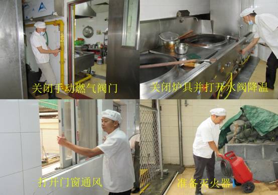 演練模擬飯?zhí)霉ぷ魅藛T在做飯過程聞到燃?xì)猱愇叮細(xì)庾詣雨P(guān)閉裝置暫未有動作,于是立即出來報告,并順路關(guān)閉手動燃?xì)忾y門。其他飯?zhí)霉ぷ魅藛T也隨即關(guān)閉燃?xì)鉅t具,相互提醒嚴(yán)禁觸摸電器開關(guān),打開爐具專用水閥放水降溫,在撤退過程準(zhǔn)備好滅火器,打開窗戶透氣。現(xiàn)場控制組在接到應(yīng)急指揮中心的命令后,對飯?zhí)贸鋈肟诶鹁渚€,接上消防水帶模擬對現(xiàn)場降溫,對需要進(jìn)入泄漏區(qū)關(guān)閉上端燃?xì)忾y門的排險人員,確認(rèn)沒有穿帶釘鞋和化纖衣服,沒有攜帶使用金屬工具。