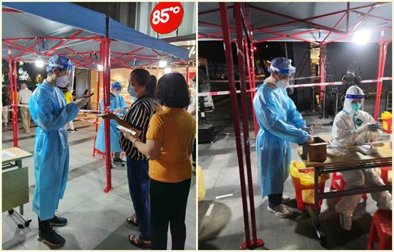 4月28日,正當(dāng)大家認(rèn)為廣州新冠病毒肺炎疫情情況已有所好轉(zhuǎn),滿懷期待準(zhǔn)備迎接“五一”假期之時(shí),不料廣州又有了新增本土確診病例。當(dāng)天下午荔灣區(qū)金花街負(fù)責(zé)組織募集核酸檢測志愿者的工作人員撥打手機(jī)找到紡織公司屬下廣州化工團(tuán)干部陳炯龍,負(fù)責(zé)人說:“小陳,我們街道晚上需要全員核酸,有空來參加嗎?”陳炯龍接到電話后沒有片刻猶豫,立刻答應(yīng)參加志愿服務(wù)。他想著今晚任務(wù)一定很重,要是多點(diǎn)人一起參加就好了,畢竟人多力量大。可接到任務(wù)時(shí),已臨近下班時(shí)間,同事們大多有了各自的安排。他試探性地問了之前和他一樣下沉白云區(qū)支援社區(qū)抗疫工作的團(tuán)員陳英東是否愿意同行。沒想到同為熱血青年的陳英東也立馬就答應(yīng)了!