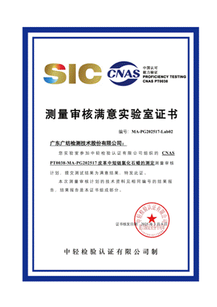 喜報(bào)!廣紡檢測成功通過中輕檢驗(yàn)認(rèn)證組織的CNAS PT0038-MA-PG202517 皮革中短鏈氯化石蠟測定測量審核,取得“結(jié)果滿意證書”!