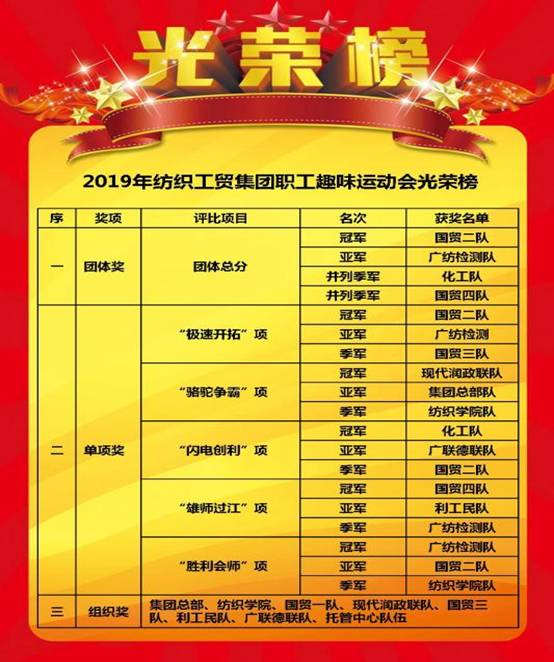 經(jīng)過緊張激烈的幾輪比拼后,國貿(mào)二隊、廣紡檢測隊、廣州化工隊和國貿(mào)四隊分別榮獲團體總分冠、亞、季軍(并列);國貿(mào)二隊、現(xiàn)代潤政聯(lián)隊、廣州化工隊、國貿(mào)四隊、廣紡檢測隊等代表隊喜摘5個單項冠軍;集團總部隊等8支隊伍獲得優(yōu)秀組織獎。(詳細獲獎名單見文末光榮榜)