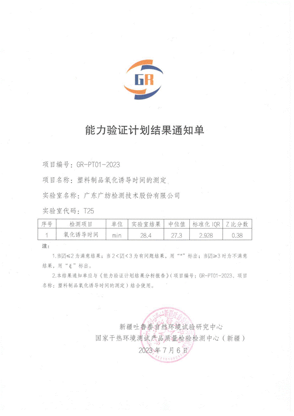 此次能力結(jié)果滿意充分反映了廣紡檢測(cè)在塑料氧化誘導(dǎo)時(shí)間的檢測(cè)方面擁有良好的技術(shù)能力,能為客戶提供準(zhǔn)確可靠的檢測(cè)服務(wù)。