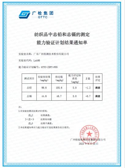 總鉛和總鎘及pH 值是紡織品化學(xué)安全性能的重要考核指標(biāo),這次權(quán)威機(jī)構(gòu)出具的能力驗(yàn)證結(jié)果,充分證明了廣紡檢測具備優(yōu)秀的化學(xué)檢測能力,能夠?yàn)榭蛻籼峁?zhǔn)確可靠的檢測服務(wù)。