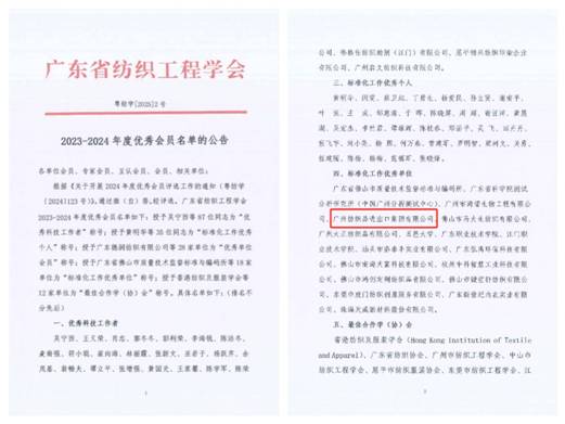 廣州紡織品進(jìn)出口集團(tuán)有限公司(以下簡(jiǎn)稱“紡出公司”)在2024年廣東省紡織工程學(xué)會(huì)開展的2023-2024年度優(yōu)秀會(huì)員評(píng)選活動(dòng)中,榮獲“標(biāo)準(zhǔn)化工作優(yōu)秀單位”稱號(hào)。關(guān)勇獲評(píng)為“標(biāo)準(zhǔn)化工作優(yōu)秀個(gè)人”,張菁、陳繼成、孫立大和高新武獲評(píng)為“優(yōu)秀科技工作者”。這一榮譽(yù)是對(duì)公司團(tuán)隊(duì)專業(yè)能力和敬業(yè)精神的高度贊揚(yáng),也是激勵(lì)每一位員工繼續(xù)秉承匠心精神,不斷探索與實(shí)踐,為紡織行業(yè)的進(jìn)步貢獻(xiàn)更多力量的巨大動(dòng)力。